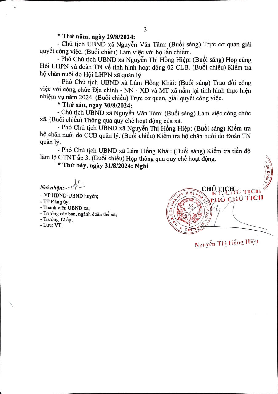 Lịch làm việc của Thường trực UBND xã Vĩnh Hòa Hưng Nam từ ngày 16 đến ngày 31 tháng 8 năm 2024