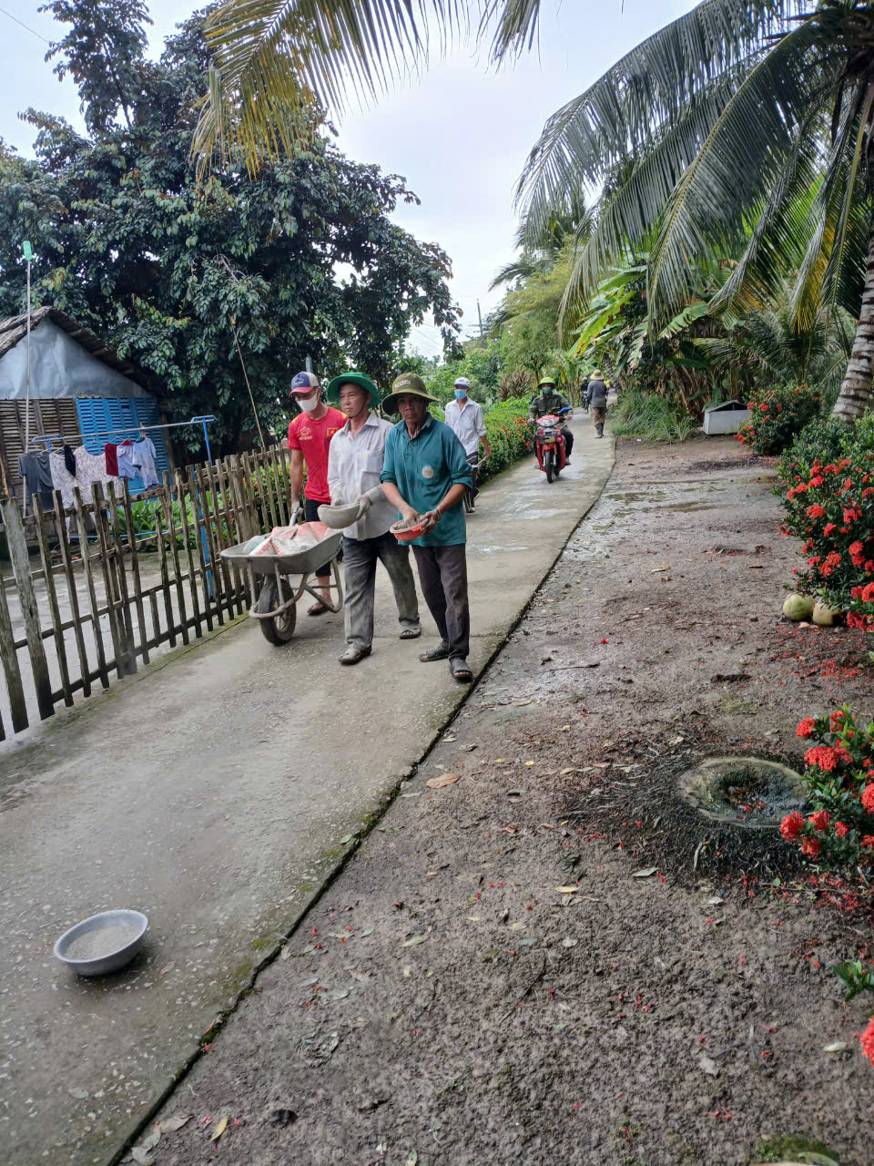 Ảnh: Người dân tham gia cùng cán bộ, đảng viên ấp thực hiện rải xi măng khử rong trên các tuyến đường GTNT.