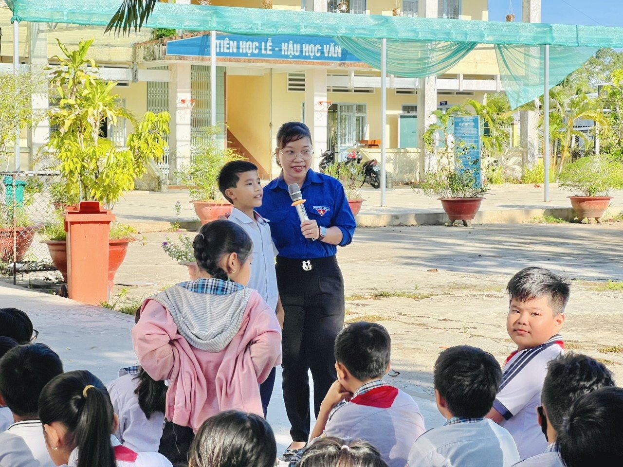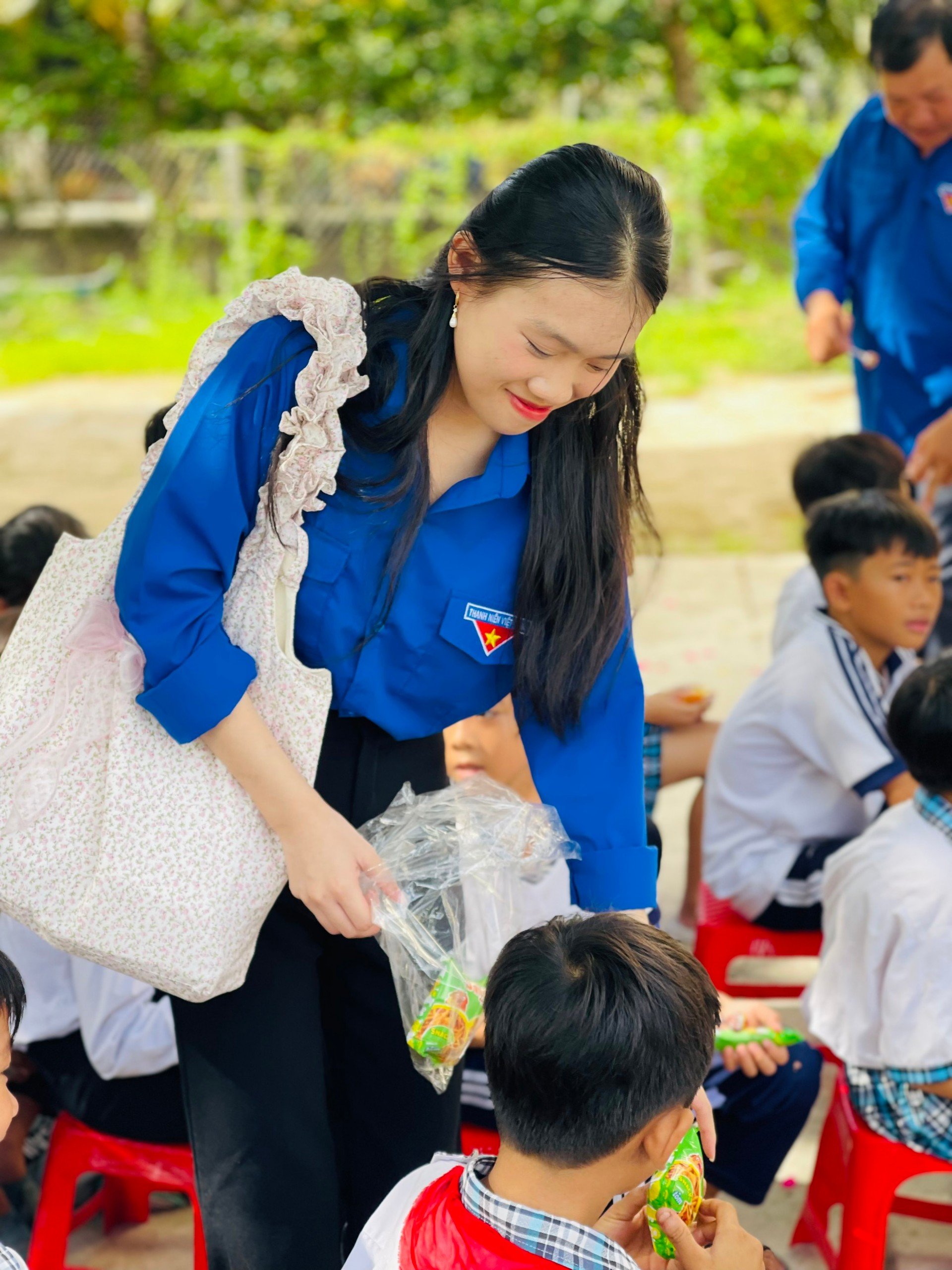Ảnh: Đồng chí Dương Thị Bích Quyền - Bí thư Đoàn TNCS Hồ Chí Minh xã Vĩnh Hòa Hưng Nam (Áo xanh) đang giao lưu với các em thiếu nhi trong hoạt động hè năm 2024
